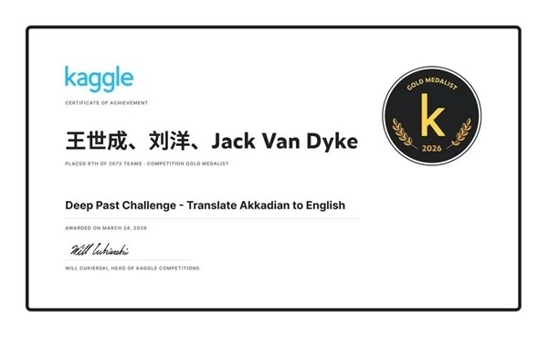 东谈主民网重庆4月10日电 (刘政宁、周小平)近日,在大众顶级数据科学竞赛平台Kaggle与Deep Past Initiative团队麇集举办的“Deep Past挑战赛”中,重庆邮电大学东谈主工智能学院2023级本科生王世成、刘洋联袂好意思国IGS Energy公司算法工程师Jack Van Dyke构成的“M&J&M”团队,从大众2673支军队中脱颖而出,名轮番6南宫游戏app平台,斩获15枚金牌中的1枚,位列参赛总东谈主数前0.2%。王世成更凭借包括本次赛事在内的多场海外顶级竞赛的累计不凡发达,获评“Kaggle竞赛众人”名称,成为重庆市首位获此大众顶级认证的本科学子。